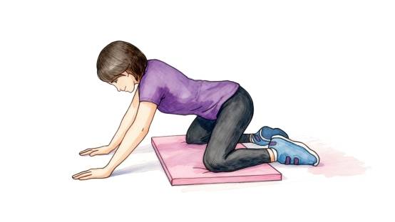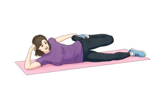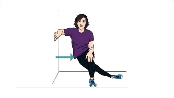 o 弯曲前腿(左腿),并将臀部向墙壁方向“送”,感觉右侧臀部外侧的拉伸。