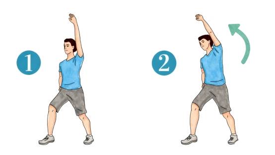 o 然后,将右臂向左侧伸展,同时身体向左侧倾斜,感受右侧大腿外侧(阔筋膜张肌)的拉伸。