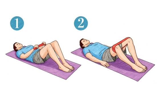 1. 仰卧,双膝屈至90度,将弹力带缠绕在双膝周围。