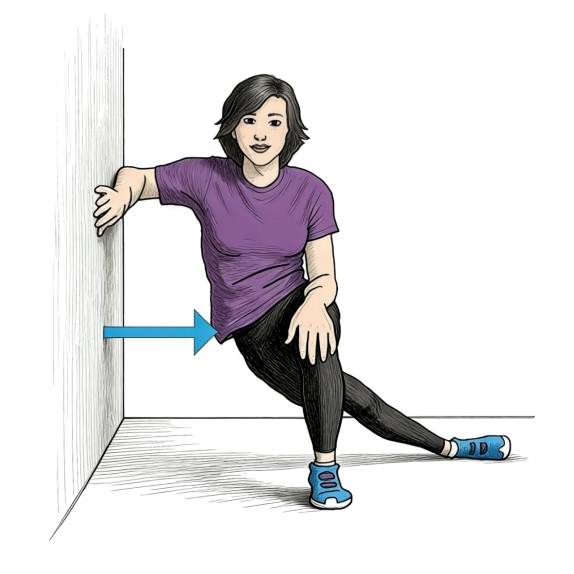 3. 弯曲前腿(左腿),髋部慢慢向墙靠近。