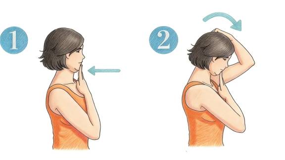 · 缓慢内收下巴并后移头部,手指保持下巴内收姿态
